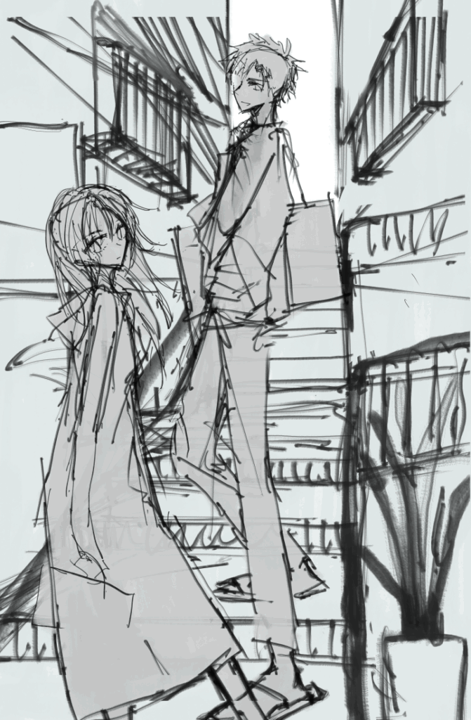 左右反転したら包帯の手が逆になってしまいましたが、心象風景なのでいいかな・・の椿さんと青島です。